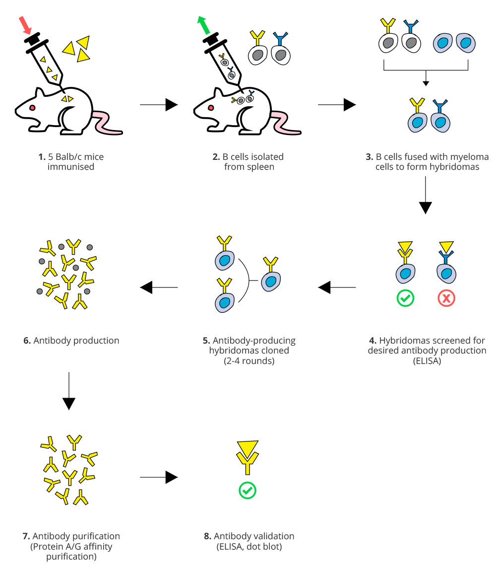 Through collaborating with you from the beginning (antigen design and quality control), the middle (sending you supernatant samples from positive clones for evaluation) and until the end (providing your desired positive clone and purified antibody) of the entire process, we guarantee our custom monoclonal antibodies will be successful in your assay.