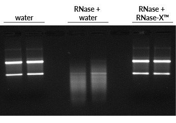 รูปที่ 1 แสดงความสามารถของ RNase-X™ ในการกำจัด RNase ออกจากพื้นผิว เพื่อจำลองพื้นผิวที่ปนเปื้อน RNase ภายในหลอดทดลองจะเคลือบด้วย RNase A จากนั้นจะถูกชะล้างด้วยน้ำ หรือ RNase-X™ แล้วล้างออกด้วยน้ำ ตัวอย่างน้ำขั้นสุดท้ายถูกบ่มด้วย RNA ของมนุษย์ทั้งหมด จากนั้นจึงรันบนเจล agarose ด้วย EMBER500™ RNA Prestain Loading Dye แถวแรก : RNA บ่มกับน้ำอย่างเดียวแสดงให้เห็นว่ามีแบนของ ribosomal RNA ชัดเจน แถวตรงกลาง : RNA บ่มกับน้ำจาก RNase-treated จะเห็นว่า RNA ถูกทำลายไป แถวสุดท้าย : RNA บ่มกับน้ำจาก RNase-treated จะเห็นว่า RNase-X™ นั้นไม่ทำให้ RNA บุบสลาย เช่นเดียวกับกลุ่มควบคุม