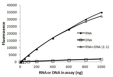 การทดสอบหาปริมาณอาร์เอ็นเอที่ใช้สีย้อมเรืองแสงเป็นวิธีที่แม่นยำที่สุดในการหาปริมาณอาร์เอ็นเอ เพราะมีความจำเพาะสูงและแม่นยำ นอกจากนี้การทดสอบบางอย่าง (แต่ไม่ใช่ทั้งหมด) ยังมีข้อได้เปรียบในจำเพาะต่อ ssRNA มากกว่า dsDNA ชุดสกัด AccuBlue® Broad Range RNA Quantitation Kit มีความจำเพาะกับอาร์เอ็นเอมากกว่า dsDNA (รูปที่ 4) ควรระวังว่าสีย้อมตรวจจับอาร์เอ็นเอเรืองแสงของบริษัทบางแห่ง เช่น RiboGreen® ไม่จำเพาะต่ออาร์เอ็นเอ และจะตรวจจับ dsDNA ที่มีอยู่ในตัวอย่างด้วย