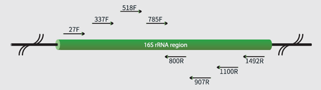 ในตัวอย่างนี้ นักวิจัยได้ส่งตัวอย่างแบคทีเรียที่พบในสิ่งแวดล้อมมาที่ Macrogen ตัวอย่างถูกสกัด DNA และทำการ PCR โดยใช้ยีน 16S rRNA และไพรเมอร์ 27F และ 1492R หลังจากนั้นหาลำดับด้วย Sanger โดยใช้ไพรเมอร์ 785F และ 907R (ภาพด้านล่าง)