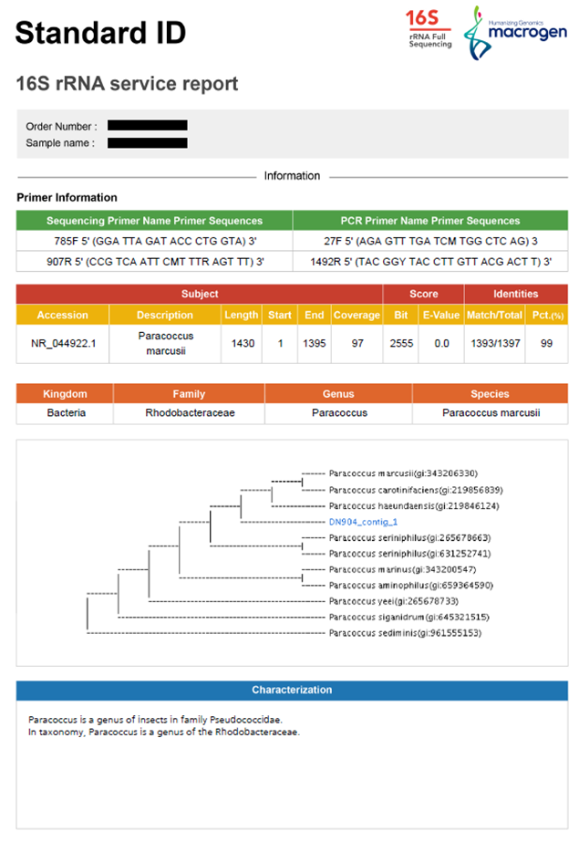 เราสามารถเห็นได้ว่าตัวอย่างแบคทีเรียถูกระบุเป็น Paracoccus marcusii ซึ่งมีความยาวลำดับ DNA อยู่ที่ 1430 เบส และมีความแม่นยำในการระบุที่ 99% นอกจากนี้รายงานยังแสดงแผนภาพ Phylogenetic tree ที่แสดงความสัมพันธ์ระหว่าง Paracoccus marcusii กับสายพันธุ์อื่นๆ ในฐานข้อมูล