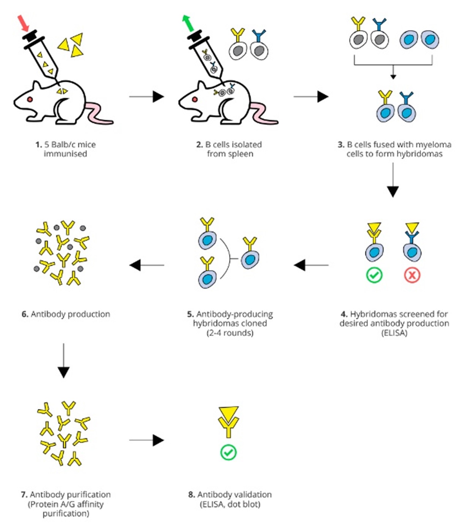 Monoclonal antibody เป็นลักษณะของแอนติบอดีที่มีความสามารถในการจับกับแอนติเจนได้เพียงส่วนเดียวเท่านั้น เนื่องจากเป็นโมเลกุลของแอนติบอดีเพียงชนิดเดียว ทำให้จับได้เฉพาะส่วนเล็กๆของแอนติเจนเท่านั้นโดย Monoclonal antibody ไม่ใช่แอนติบอดี ทีเกิดขึ้นเองตามธรรมชาติ แต่ถูกสร้างขึ้นจากเทคนิคทางวิทยาศาสตร์ เพื่อการศึกษาและการประยุกต์ใช้ความสามารถในการจับกันอย่างเฉพาะเจาะจงระหว่างแอนติบอดีและแอนติเจน โดยทั่วไป Monoclonal antibody นั้นผลิตได้จากการกระตุ้นระบบภูมิคุ้มกันของสัตว์ทดลองด้วย แอนติเจนที่ต้องการ แล้วใช้เทคนิคในการสร้างเซลล์ลูกผสม (Hybridoma technology) ระหว่าง B lymphocyte ที่มีหน้าที่ในการผลิตแอนติบอดี และ myeloma cell หรือเซลล์มะเร็งเม็ดเลือดขาวเพื่อการเพิ่มจำนวน