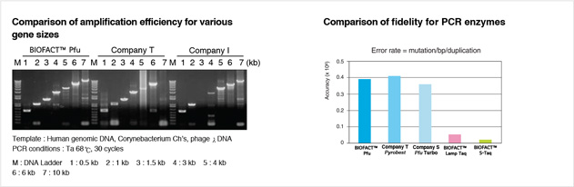 BioFact™ Pfu DNA Polymerase, a product of recombinant type DNA polymerase from Pyrococcus furiosus, is a suitable product for high-fidelity PCR amplification. The error rate of BioFact™ Pfu DNA Polymerase is 12 times lower than BioFact™ S-Taq DNA Polymerase due to its intrinsic 3’ to 5’ exonuclease activity. It produces blunt ended PCR products and it enables blunt cloning directly using BioFact™ All-in PCR Cloning Kit without A-tailing step. Providing optional 5X Band Helper™ helps amplification of difficult PCR caused by High GC content or complex structure of template.