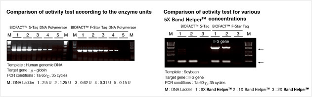 BioFact™ F-Star Taq DNA Polymerase is a chemically modified HotStart Taq DNA polymerase and it is useful for preventing or minimizing non-specific DNA amplification in PCR. BioFact™ F-Star Taq DNA Polymerase is suitable amplification of a relatively long-length target which is required high specificity and high sensitivity in PCR. It enables amplification of target DNA up to 21 in a single reaction at once. Optimal buffer system and optional 5X Band Helper™ helps amplification of difficult PCR which is due to high GC content and complex structure.