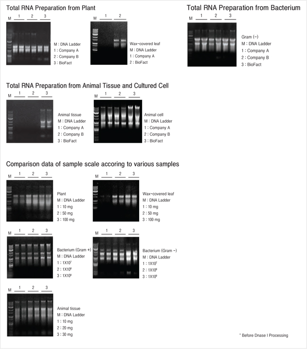 BioFACT™ Total RNA Prep Kit (Ver.2.0) is intended for isolation of high quality RNA from various samples using glass microfiber membrane as a spin column type. In particular, it is using convenient method for the isolation of pure RNA directly from various samples including plant, bacterium, animal tissue and animal cell. BioFACT™ Total RNA Prep Kit (Ver.2.0) is a safe system which is designed to avoid completely the use of toxic and hazardous reagents such as phenol/chloroform.