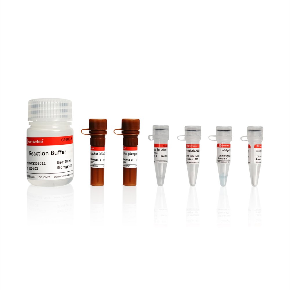EdU (5-ethynyl-2'-deoxyuridine) is a thymidine analog containing an acetylene group that when injected into animals or incubated with cells in vitro, these Small molecules can rapidly diffuse into various organs and tissues, penetrate into cells, and can be incorporated into newly synthesized DNA in place of thymidine (T) during cell proliferation. The acetylene group in the EdU molecule can undergo a "click" reaction with the fluorescently labeled azide probe under the catalysis of copper ions to form a stable triazole ring, so the newly synthesized DNA can be labeled with the corresponding fluorescent probe. Compared with the radiolabeled nucleoside incorporation method, the EdU detection method has no limitations such as radioactive contamination; compared with the BrdU detection method, the EdU detection method does not require DNA denaturation treatment, nor does it require antigen-antibody reaction, which greatly reduces the complexity of the experiment and time, and makes it more time-efficient, more responsive, more stable and more accurate. This kit can be used to detect cell proliferation in cells cultured in vitro or in animal tissues. The fluorescent probe in this kit is red fluorescence with a maximum excitation wavelength of 593 nm and a maximum emission wavelength of 614 nm. After the proliferating cells are labeled, the nucleus will show bright red fluorescence, and the nuclei will be labeled with a conventional nuclear dye (Hoechst 33342 nuclear dye is provided in this kit). The fluorescence intensity of the in vitro cultured cell population can also be detected by flow cytometry, and the DNA replication activity in the S phase of the cell cycle can be judged according to the fluorescence intensity.