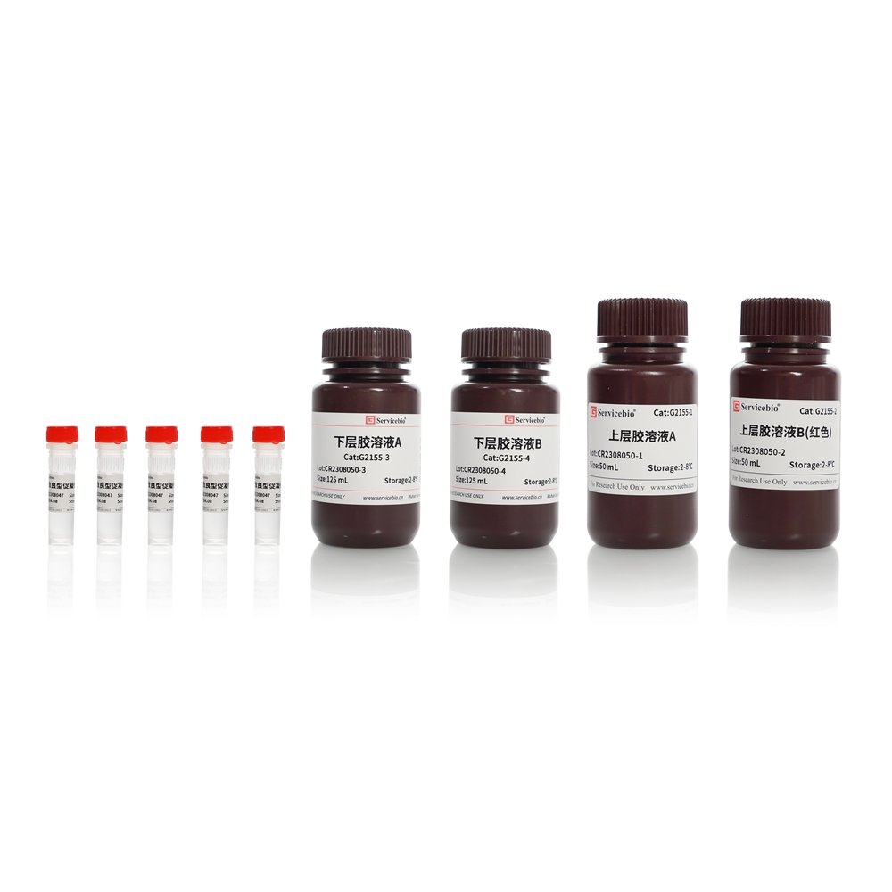 This kit provides a simple and rapid preparation reagent for PAGE colored (red) gel Cast Kit capable of simultaneously preparing stacking, resolving, and upper gels. Users only need to prepare the gel casting apparatus to rapidly prepare protein gels. Additionally, the solution B in the stacker gel of the kit contains a red dye, allowing for clear visualization of protein sample wells, greatly enhancing the efficiency of sample loading. This red dye can stably exist in the stacker gel without migrating to the resolver gel during electrophoresis, thus not affecting electrophoresis and staining results. It is also easy to identify and excise the stacker gel after electrophoresis completion, without impacting subsequent experiments such as Western Blot. The gel prepared in this kit does not contain SDS and can be used for denaturing or non-denaturing PAGE gel electrophoresis, which is specially used for the separation of large molecular proteins (300 kDa); the concentration of the stacker gel is 3%, and the concentration of the resolver gel is 7% after the formulation.