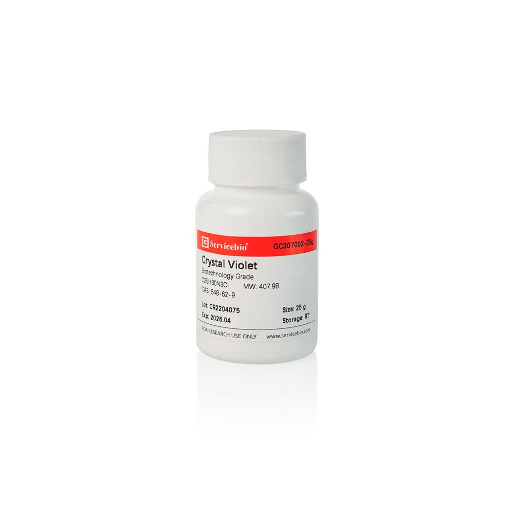 Crystal Violet, also known as Methylrosanilnium Chloride Solution, gentian violet, is a triphenylmethane dye which commonly is used in Gram stains for bacterial classification, or for cellular or histological staining. The mechanism of crystal violet staining is that the crystal violet binds to carbohydrate molecules such as DNA or peptidoglycan (one of the important components of bacterial cell walls), and then stain it a deep purple color. Gram staining method using crystal violet and Safranin O stain to distinguish G+ bacteria and G- bacteria staining principle is that the former cell wall contains a thick peptidoglycan layer, crystal violet and iodine complex can be retained in the cell and will not be decolorized; the latter contains only a very thin layer of peptidoglycan, and the complex of crystal violet and iodine is decolorized away, thus being reddened by Safranin O.In addition, for the property of crystal violet is binding to nucleic acids and stain cell nuclei, crystal violet is also commonly used for cell viability or cytotoxicity assays, such as colony formation, plaque assay, cell migration and other experiments.