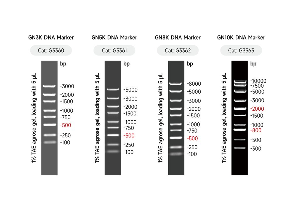 The GN100bp DNA Ladder III plus consists of 14 linear double-stranded DNA (100 bp, 200 bp, 300 bp, 400 bp, 500 bp, 600 bp, 700 bp, 800 bp, 900 bp, 1000 bp, 1500 bp, 2000 bp, 3000 bp, 5000 bp) bands mixed with 1×DNA Loading Buffer containing a blue indicator dye and is suitable for analysis of DNA bands in agarose gel electrophoresis. This product is ready-to-use, according to the experimental needs, take 5-10 μL electrophoresis, easy to use, clear electrophoresis bands, easy to accurately determine the content of the target product DNA. The 500 bp band in GN100bp DNA Ladder III plus has a DNA concentration of 100 ng/5 μL and shows a bright band; the remaining bands have a DNA concentration of 50 ng/5 μL.