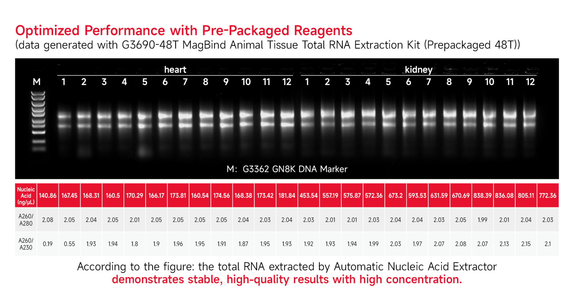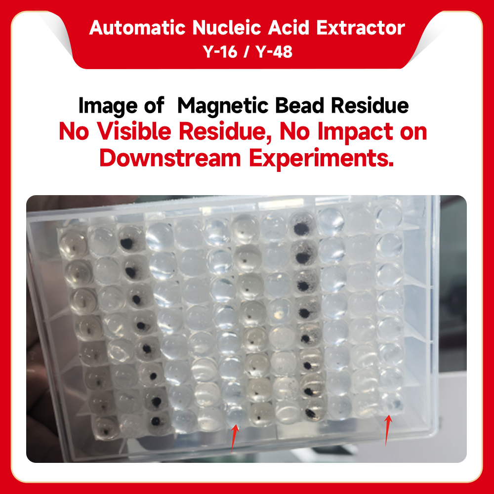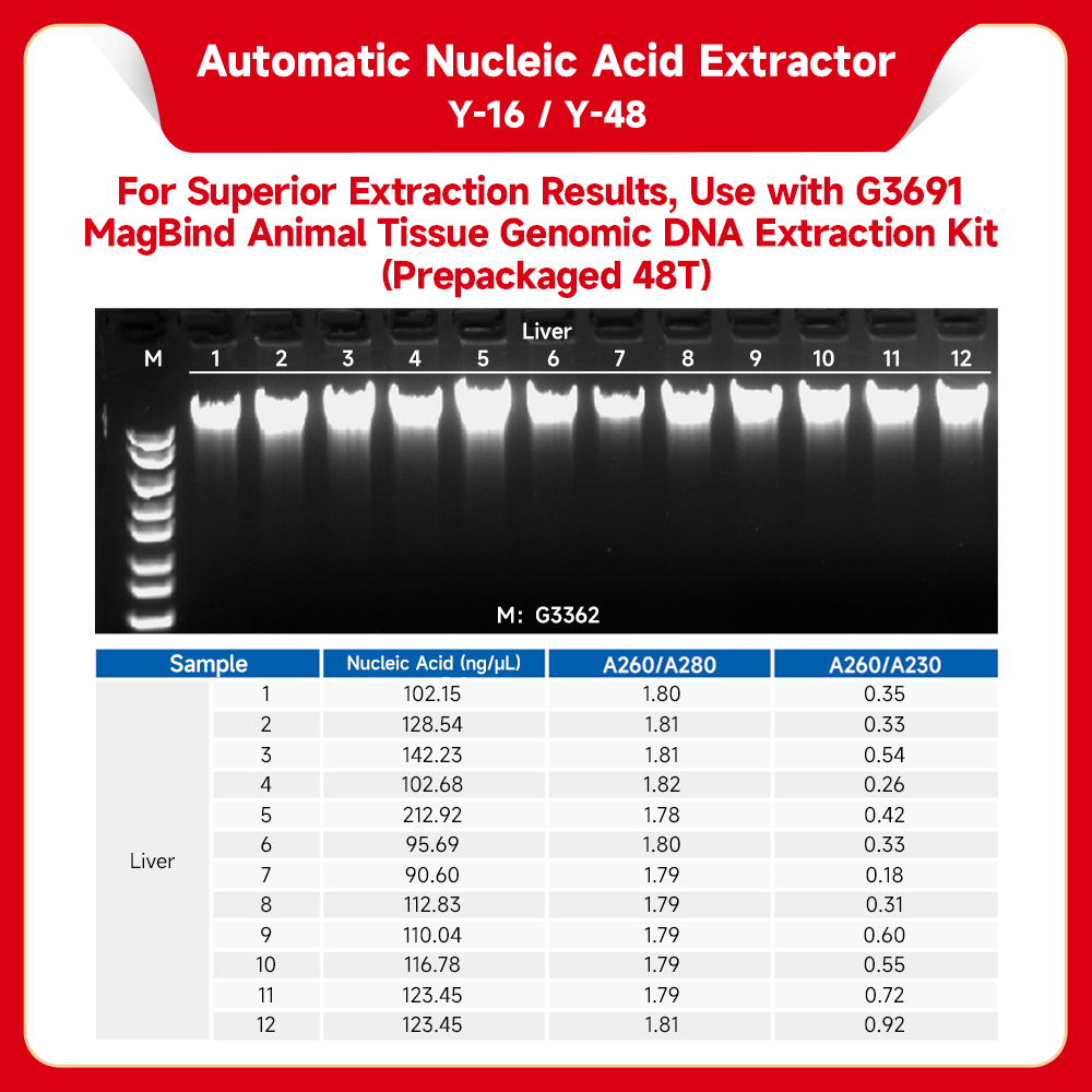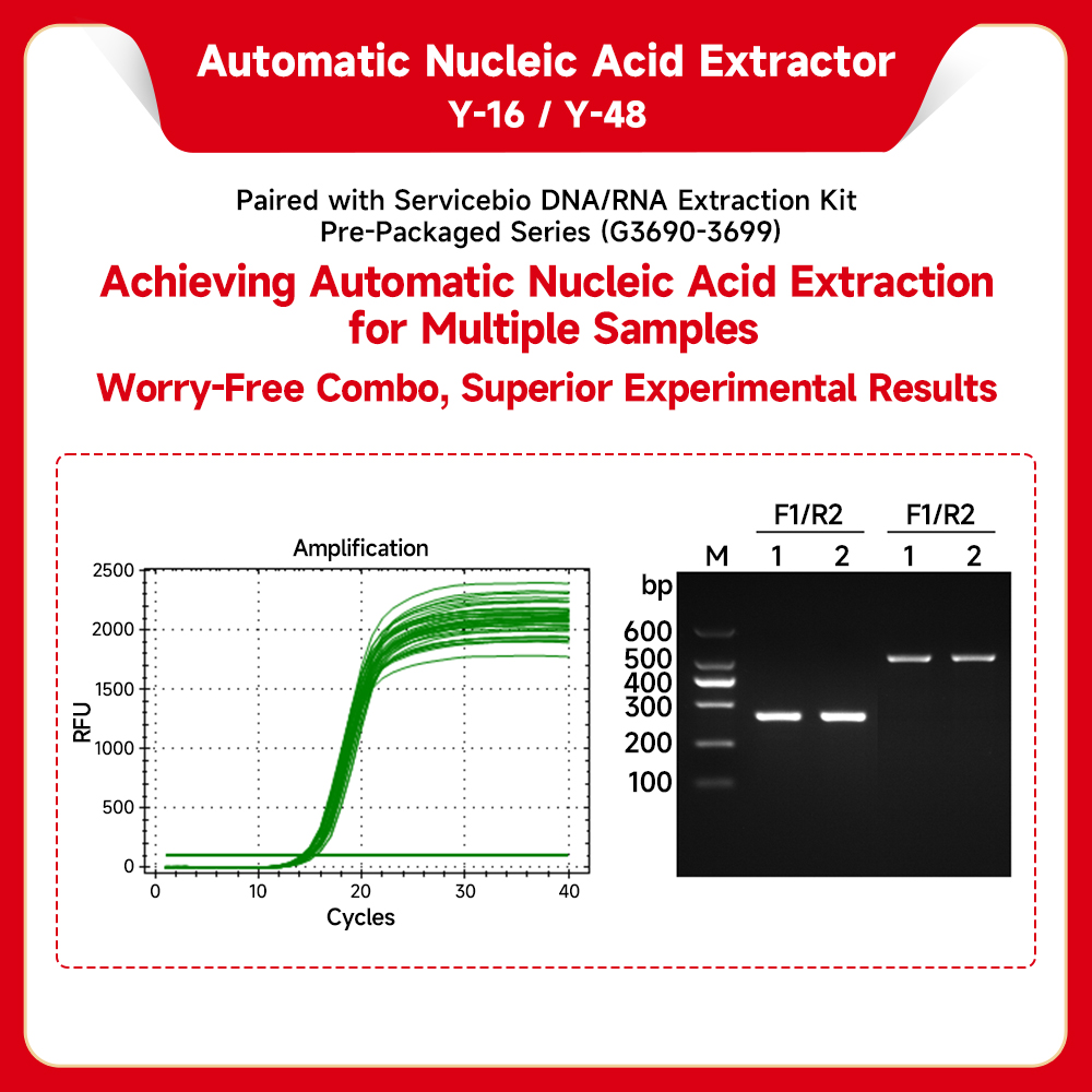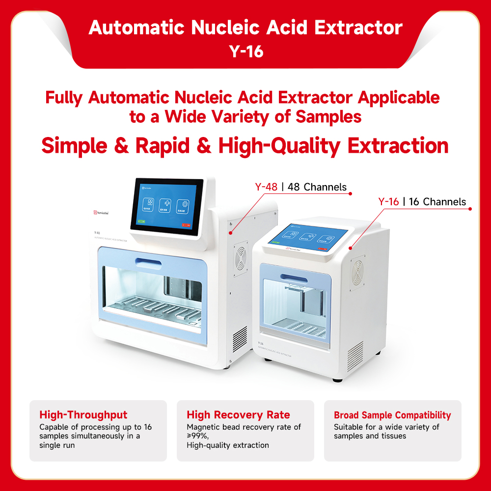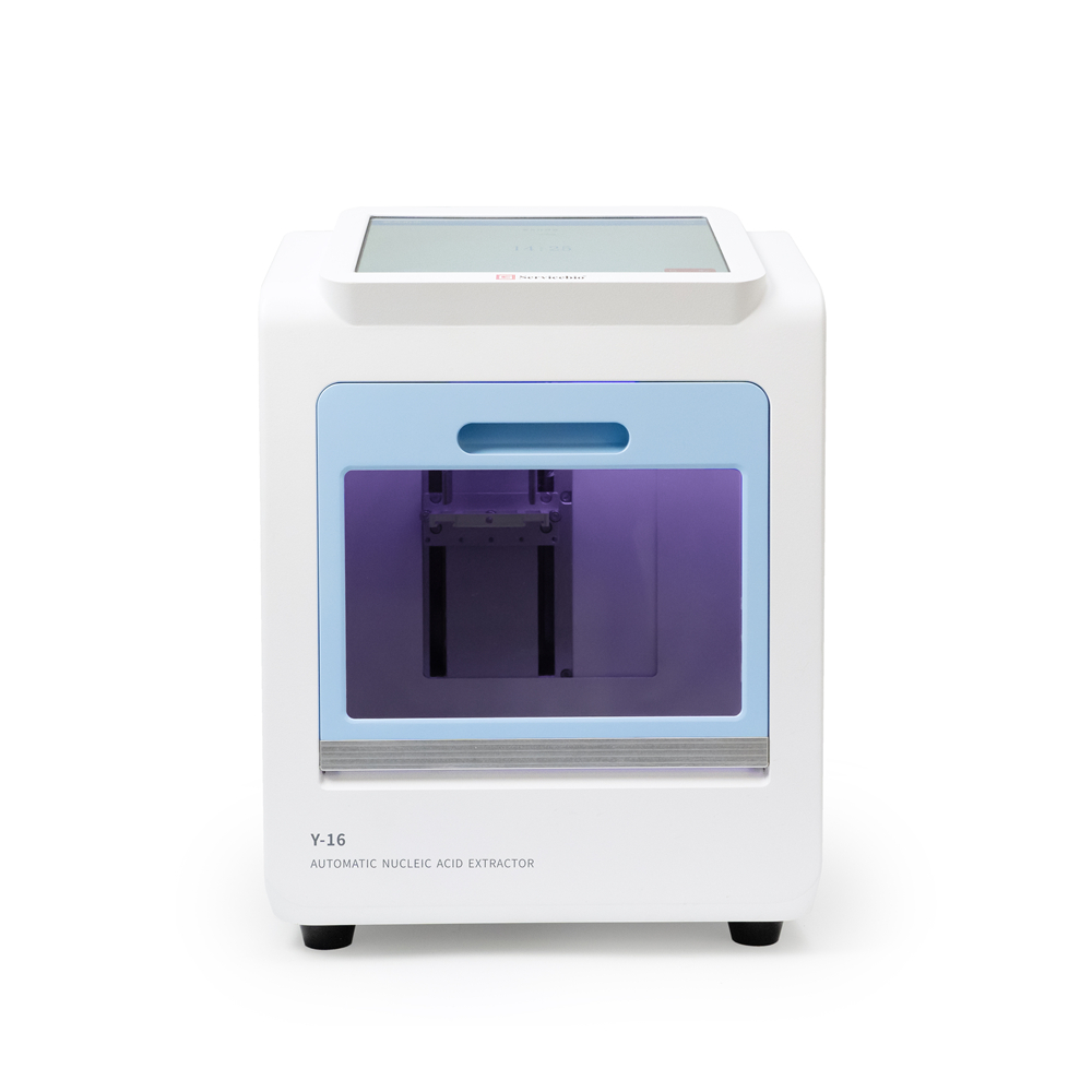 The Nucleic Acid Extractor Y-16 is designed for nucleic acid extraction from a variety of sample types. It can process up to 16 samples simultaneously in a single run, offering a simple, rapid, and high-quality extraction process with no visible magnetic bead residues. When used in conjunction with the MagBind Animal Tissue Total RNA Extraction Kit (Prepackaged 48T)G3690-48T and the MagBind Animal Tissue Genomic DNA Extraction Kit (Prepackaged 48T)G3691-48T, it enhances the efficiency and quality of nucleic acid extraction. Moreover, when combined with Servicebio's pre-packaged nucleic acid extraction product series, it enables automated nucleic acid extraction from diverse samples, providing a hassle-free solution and yielding superior experimental results.