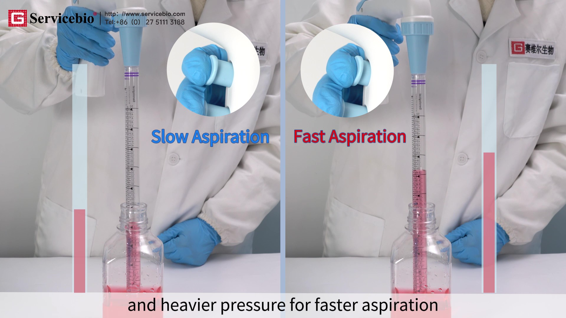 After inserting the pipette into the adaptor, place it in the target liquid and press the aspiration button, the pipette will aspirate the liquid. The greater the pressing distance and force, the faster the liquid will be aspirated; conversely, a smaller pressing distance and force will result in slower aspiration.