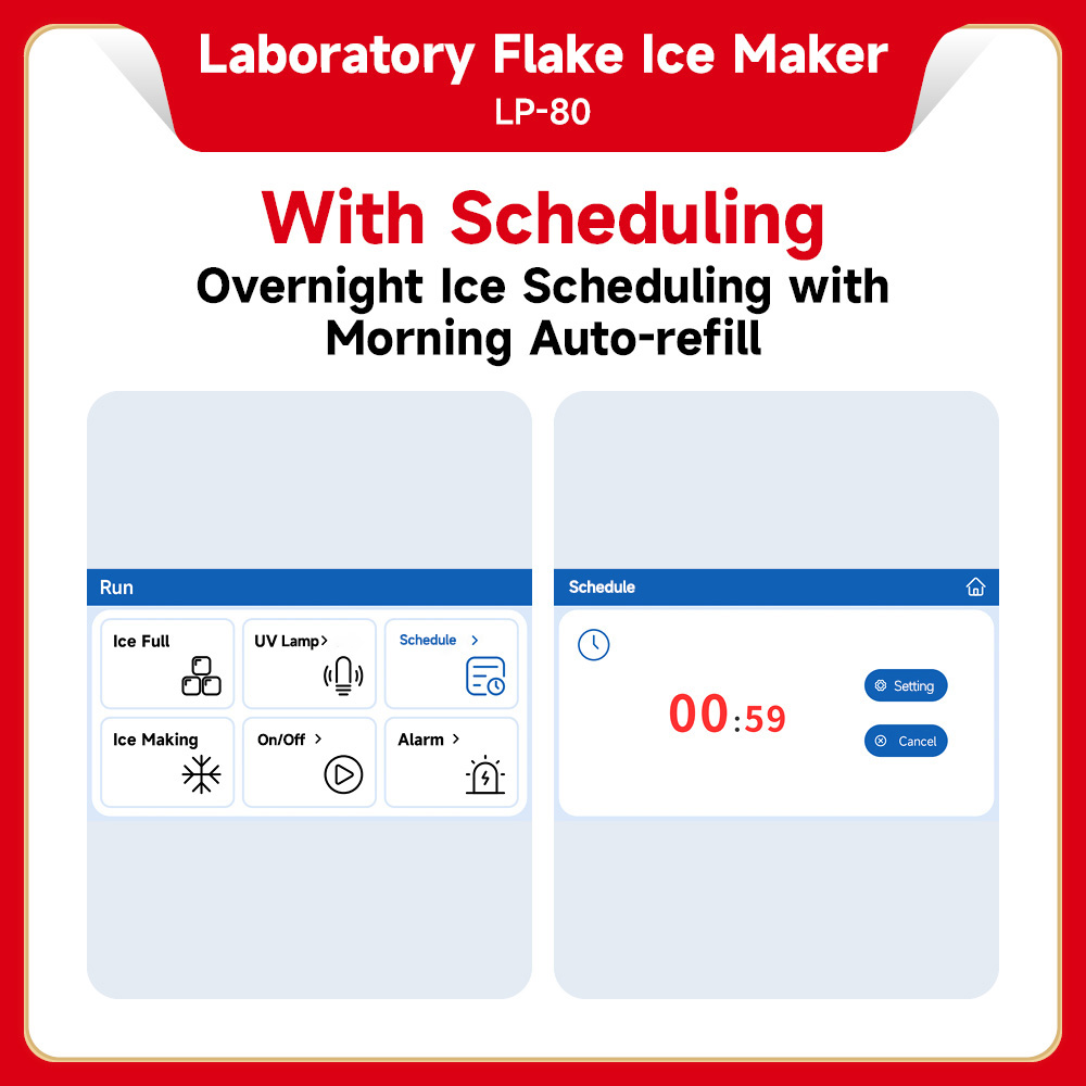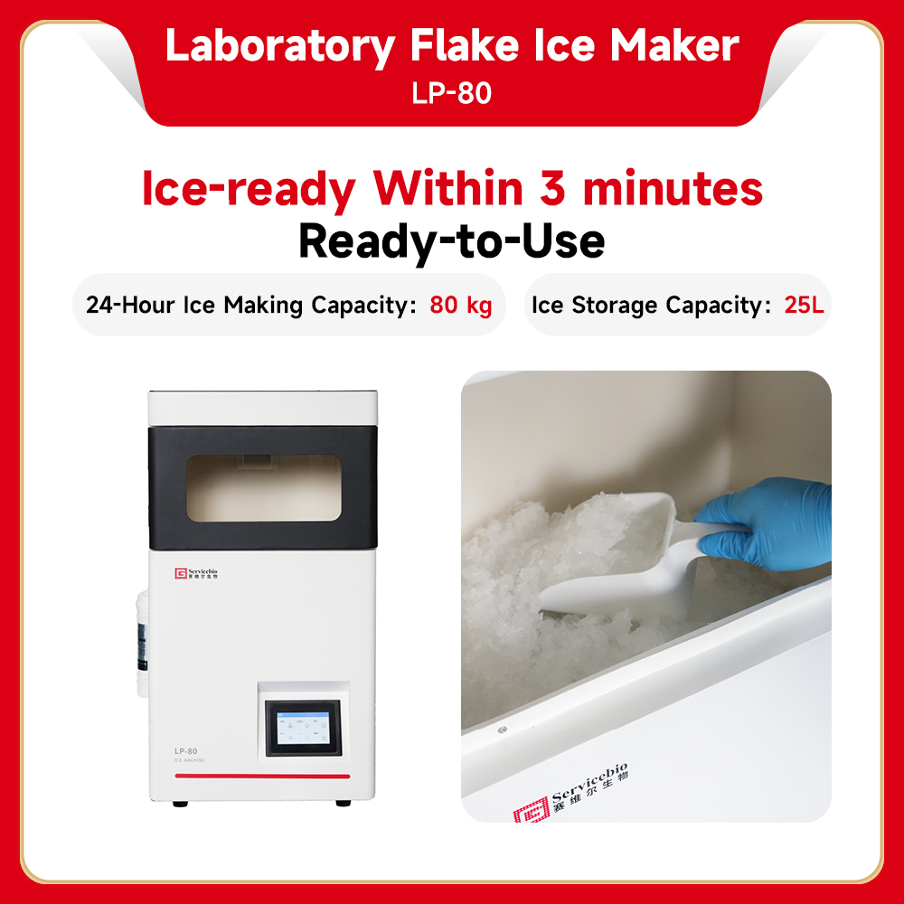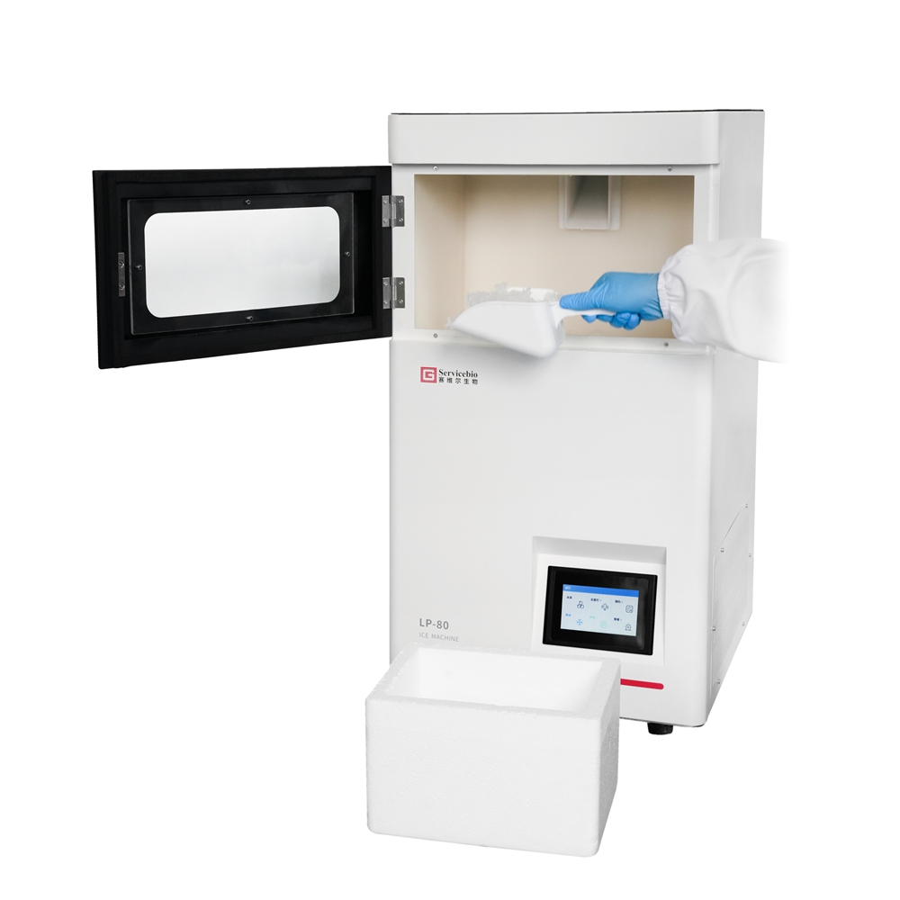 Servicebio's self-developed ice maker features a rectangular, monolithic design with a simple and modern aesthetic. It supports continuous and highly efficient ice production, boasting core advantages such as rapid ice output and a high ice production capacity per unit of time.The ice produced by this machine is in the form of amorphous, fine granular snow ice. It has a moist texture with a water content typically ranging from 15% to 25% and a temperature slightly below zero degrees Celsius. This type of ice offers excellent plasticity, making it easy to handle and mound. It readily penetrates narrow gaps, provides rapid cooling, and delivers an effective ice bath experience. It is specifically designed for laboratory use.