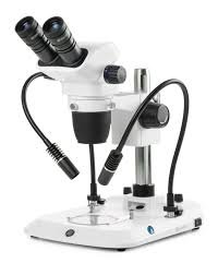 Binocular stereo zoom microscope NexiusZoom, 0.67x to 4.5x zoom objective, magnification from 6.7x to 45x with pillar stand. Two incident LED illuminations with Gooseneck and one transmitted 3 W LED illumination