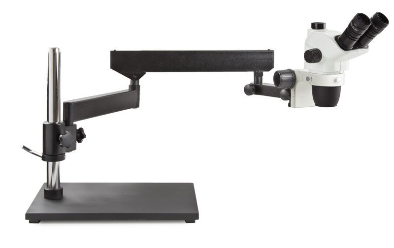 Trinocular stereo zoom microscope NexiusZoom, 0.67x to 4.5x zoom objective, magnification from 6.7x to 45x with articulated stand with heavy tabletop stand. Without illumination