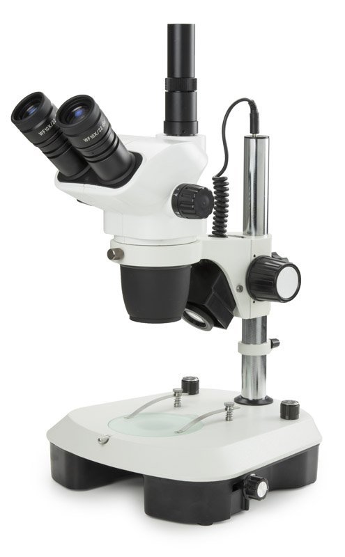 Trinocular stereo zoom microscope NexiusZoom, 0.67x to 4.5x zoom objective, magnification from 6.7x to 45x with pillar stand. Incident 3 W LED illumination and transmitted 3 W LED illuminations with rotating mirror
