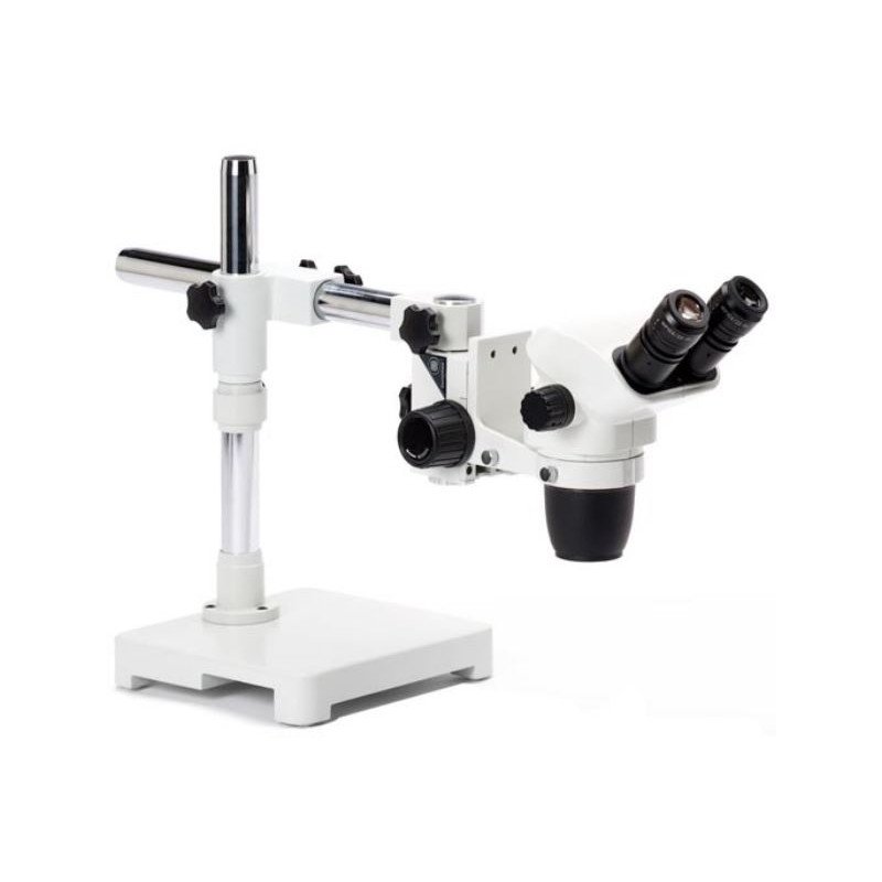 Binocular stereo zoom microscope NexiusZoom EVO, 0.65x to 5.5x zoom objective, magnification from 6.5x to 55x with universal one-arm stand. Without illumination