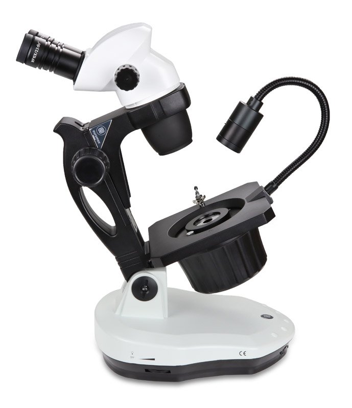 The specialized backwards tilting stand of the NexiusZoom and NexiusZoom EVO stereo microscopes for gemology applications offers 30W halogen transmitted illumination towards the specimen at oblique angles. This enables the examination of your gems in perfect darkfield conditions. The stand is available with 1 W LED or a 7 W fluorescent incident illumination for brightfield contrast