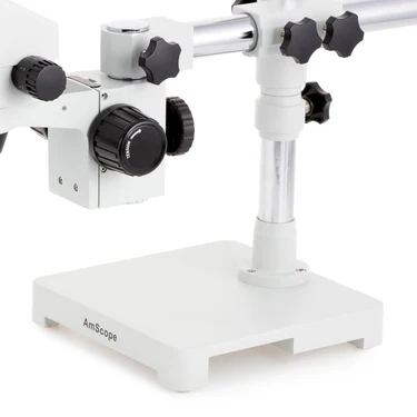 The multi-pivoting stand provides a stable, flexible support system, ideal for hands-on work. The single-arm design provides heavy-duty support in a simple form. The head can be turned 360°, the focus-block can swing in either direction, and the lateral arm can rotate and swing to position the head at virtually any angle. The heavy, steel base ensures the stability of the microscope, even when laden with attachments.