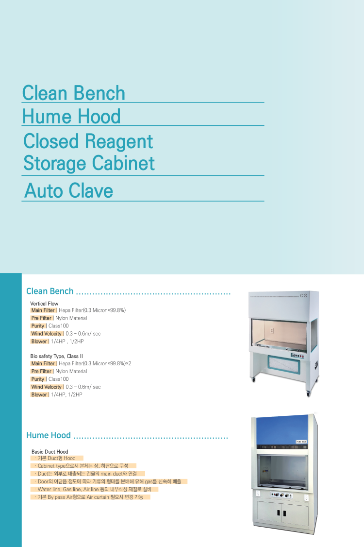 Clean Bench, Hume Hood, Closed Reagent Storage Cabinet, Auto Clave