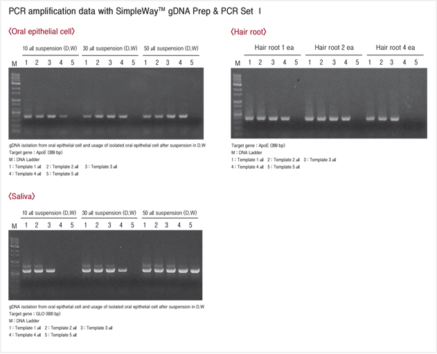 SimpleWay™ Direct PCR Kit I is a suitable product for direct PCR amplification without any preparation step at all from various samples such as Blood, Saliva and Oral Epithelial Cell. Through SimpleWay™ 2X Direct Master Mix, it is available to perform fast and convenient PCR amplification.