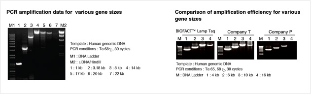 BioFact™ Lamp Taq DNA Polymerase is suitable and ideal for long-ranged PCR up to 40 kb. This enzyme is blended with optimized rate using two enzymes from Pyrococcus furiosus and Thermus aquaticus to make dual advantages. BioFact™ Lamp Taq DNA Polymerase generates sufficient product with an A overhang, eliminating the need to add A overhangs post PCR to apply TA cloning of PCR product directly. BioFact™ Lamp Taq DNA Polymerase is useful to amplification which is required higher sensitivity and productivity in long-range PCR.