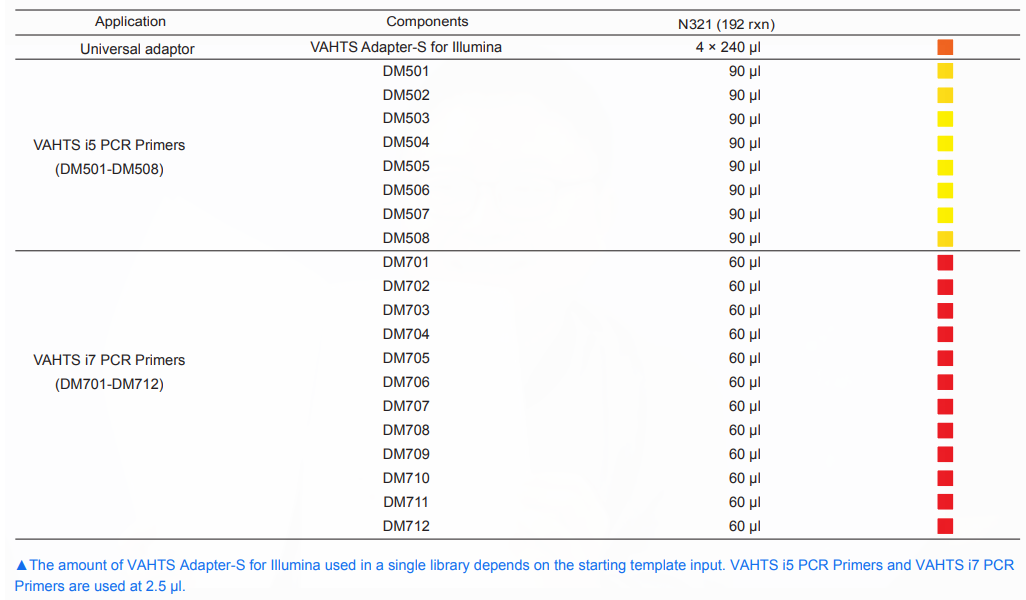 VAHTS Multiplex Oligos Set 5 for Illumina is a special library preparation kit for Illumina high-throughput sequencing platform. The kit contains VAHTS Adapter-S for Illumina, 8 VAHTS i5 PCR Primers, and 12 VAHTS i7 PCR Primers. VAHTS Universal DNA Library Prep Kit for Illumina V3(Vazyme #ND607) and VAHTS Universal Pro DNA Library Prep Kit for Illumina Illumina(Vazyme #ND608), can be used to build up to 96 different combinations of two-ended Index tag libraries. In conjunction with VAHTS Multiplex Oligos Set 4 for Illumina, it can be used to construct double-ended Index marker libraries with up to 384 different combinations. All reagents provided in the kit have undergone strict quality control and functional validation to ensure the stability and repeatability of library preparation to the greatest extent.