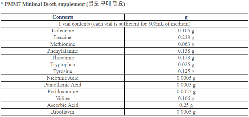 Suspend 8.57 G of powder in 1 L of distilled or deionized water. Heat to boiling until completely dissolved. Sterilized by autoclave at 121°C for 15 minutes. Cool to 45 - 50°C in water bath. If necessary, aseptically add 2 vials of PMM7 Minimal Broth supplement (MB-P0733). Mix well. Pour into tubes.