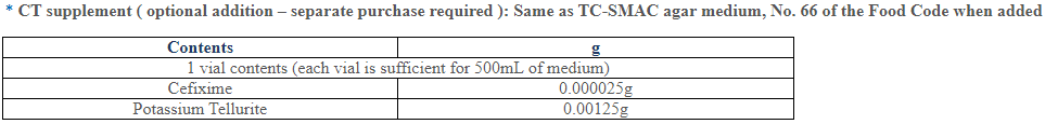Suspend 50.03 G of powder in 1 L of distilled or deionized water. Heat to boiling until completely dissolved. Sterilize by autoclave at 121°C for 15 minutes. Cool to 45 - 50°C in water bath. If necessary, aseptically add 2 vials of CT (Cefixime Tellurite) supplement (MB-C0760) (TC-SMAC Agar). Mix well. Pour into petri dishes.