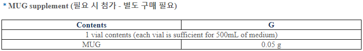 Suspend 35.6 G of powder in 1 L of distilled or deionized water, suspend 71.2 G of powder in 1L of distilled or deionized water for double strength or suspend 106.8 G of powder in 1L of distilled or deionized water for triple strength. Heat to boiling until completely dissolved. Sterilize by autoclave at 121°C for 15 minutes. Cool to 45- 50°C in water bath. Mix well. Dispense in tubes. If necessary aseptically add 2 vials of MUG supplement (MBM1820).