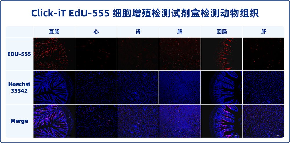 Use fluorescence microscope or confocal microscope to detect processed cells or tissue section samples, and analyze the proportion of proliferating cells. Alternatively, cells cultured in vitro can be collected and the fluorescence intensity can be measured by flow cytometry (it is recommended to use cell samples not labeled with EdU as a negative control for the flow cytometry assay and to choose the appropriate voltage), and based on the fluorescence intensity, the DNA replication activity of the S-phase in the cell cycle can be determined. The fluorescent dye if555 (Reagent B) in this kit corresponds to the spectral characterization of Ex/Em: 557 nm/570 nm (red); Hoechst 33342 staining solution corresponds to the spectral characterization of Ex/Em: 346 nm/460 nm (blue).