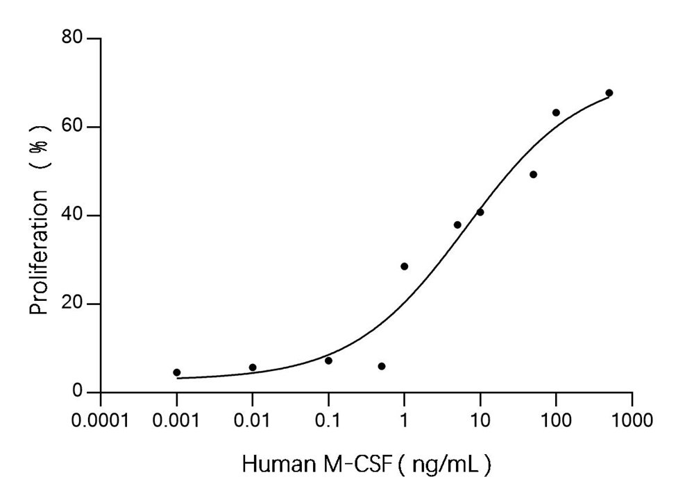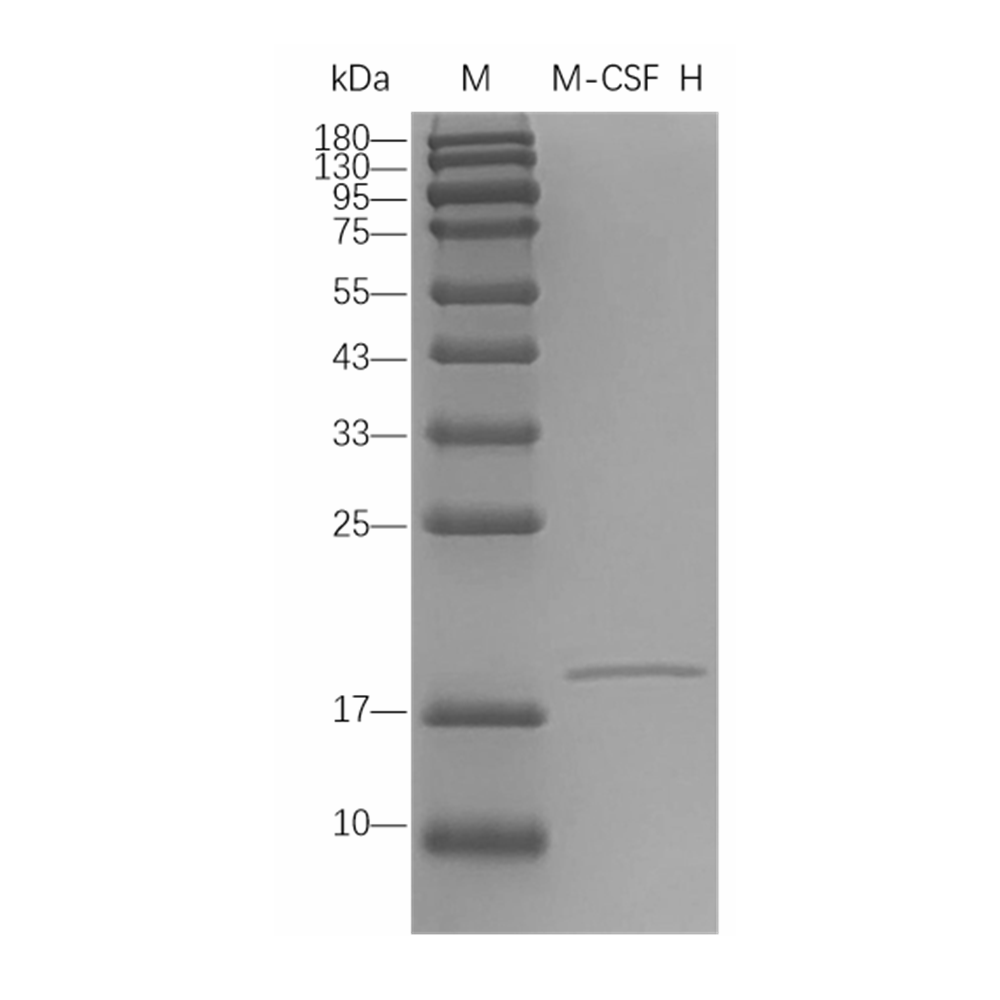 Recombinant Human M-CSF Protein was determined by SDS-PAGE with Coomassie Blue. | Measured in a cell proliferation assay using M-NFS-60 mouse myelogenous leukemia lymphoblast cells. The ED50 for this effect is 5-10 ng/mL. | |