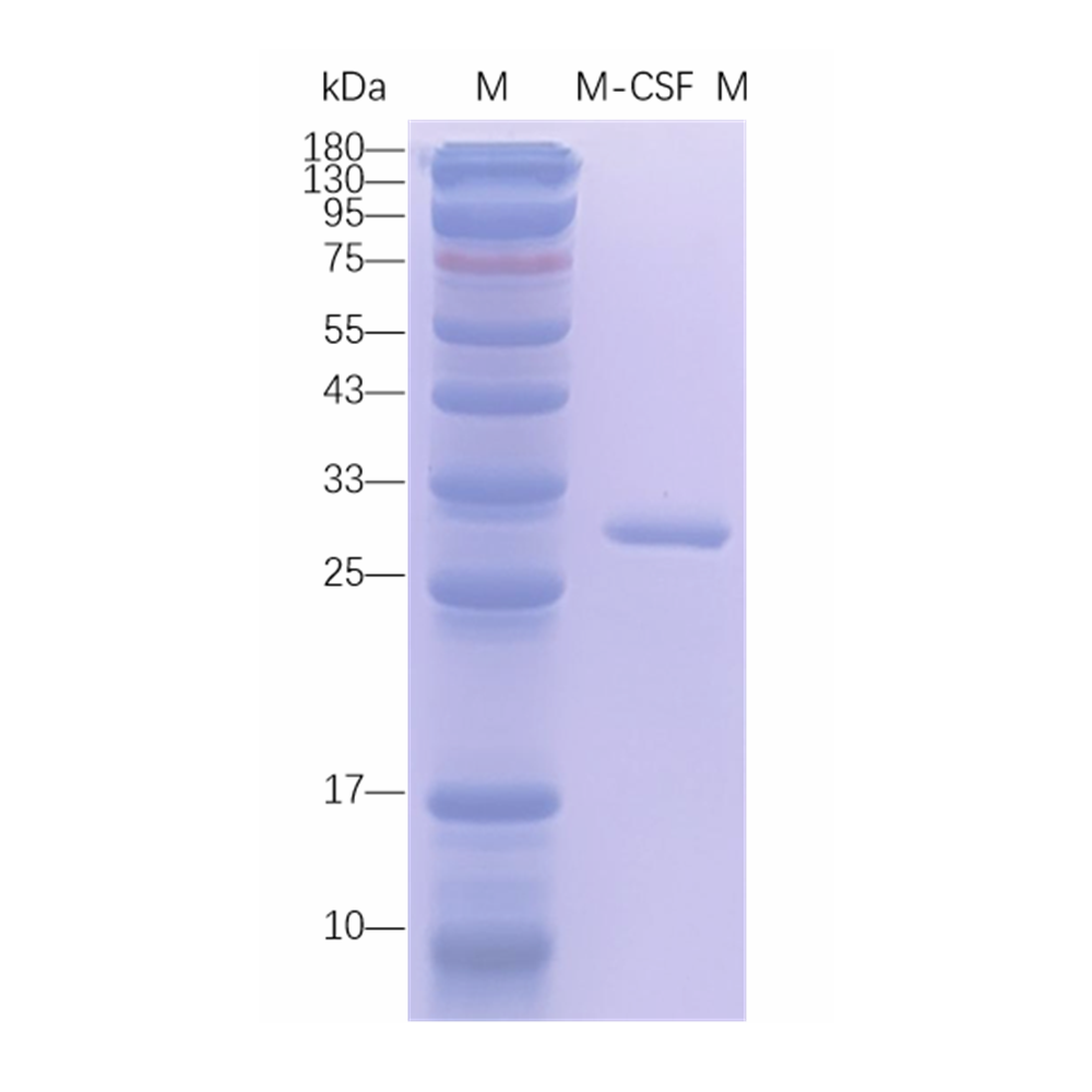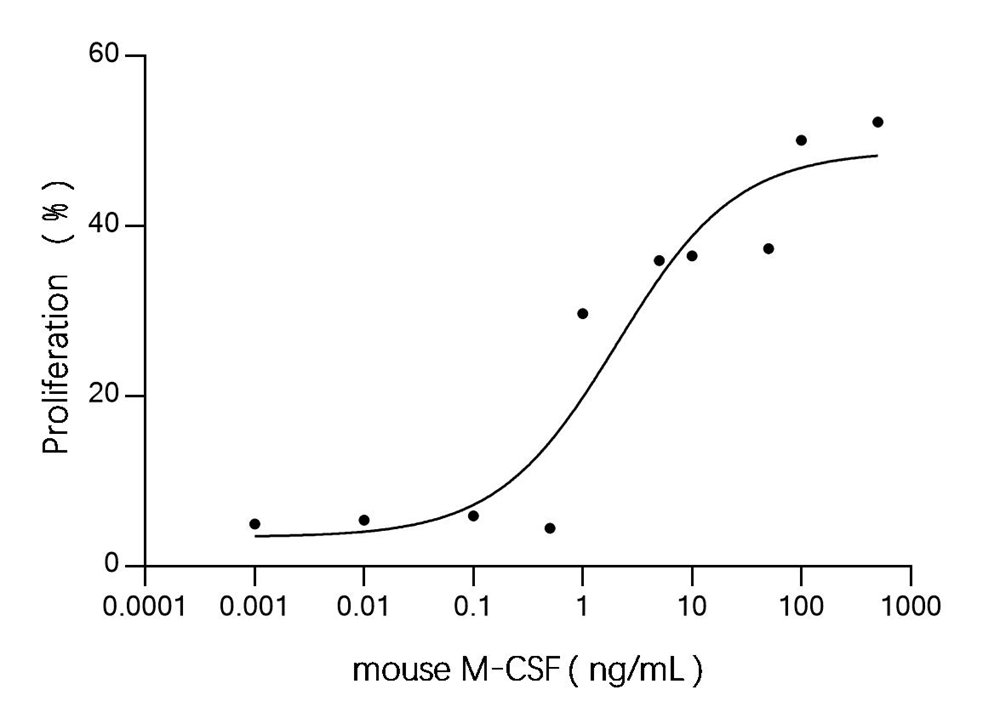 Recombinant Mouse M-CSF Protein was determined by SDS-PAGE with Coomassie Blue. | Measured in a cell proliferation assay using M-NFS-60 mouse myelogenous leukemia lymphoblast cells. The ED50 for this effect is 1-5 ng/mL. | |