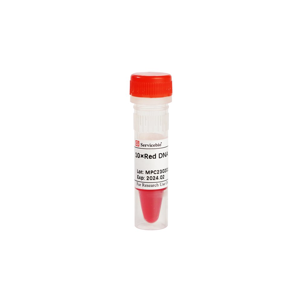 10×Red DNA Loading Buffer is a tenfold concentrated DNA sample buffer, the premixed sample buffer contains two dyes, the first red dye and the second orange dye, which can be used as indicator dyes in agarose electrophoresis. The migration of red dye in 1×TAE Buffer and 1% agarose gel is about 370 bp, and in 1×TBE Buffer and 1% agarose gel is about 220 bp. The migration of orange dye in 1×TAE or 1×TBE buffer and 1% agarose gel is below 100 bp. Neither dye leaves a shadow during UV imaging and also contains EDTA, which chelates divalent metal ions, thereby inhibiting metal-dependent nuclease activity.