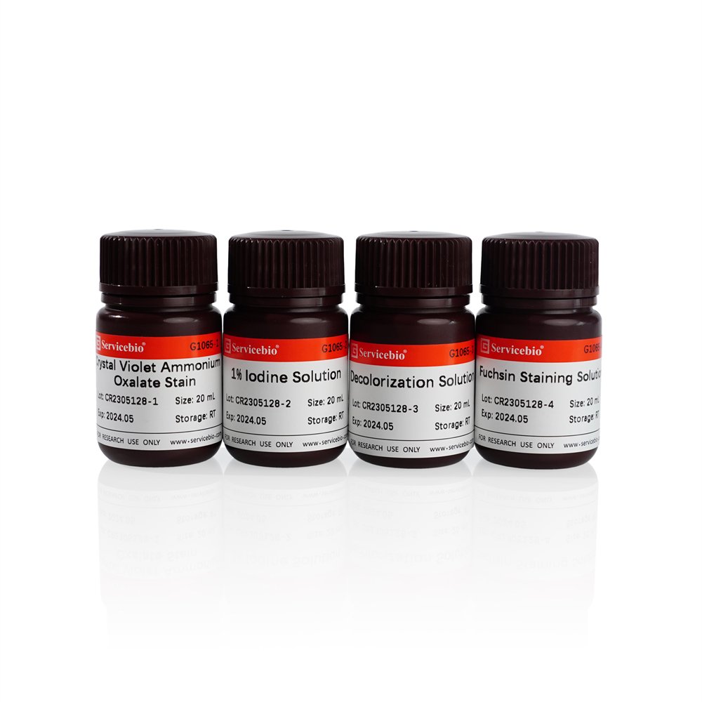 Gram staining solution contains four components, namely ammonium oxalate crystal violet staining solution, 1% iodine solution, destaining solution and fuchsin staining solution. After staining, gram-positive bacteria appear purple to blue-purple, and gram-negative bacteria appear red.