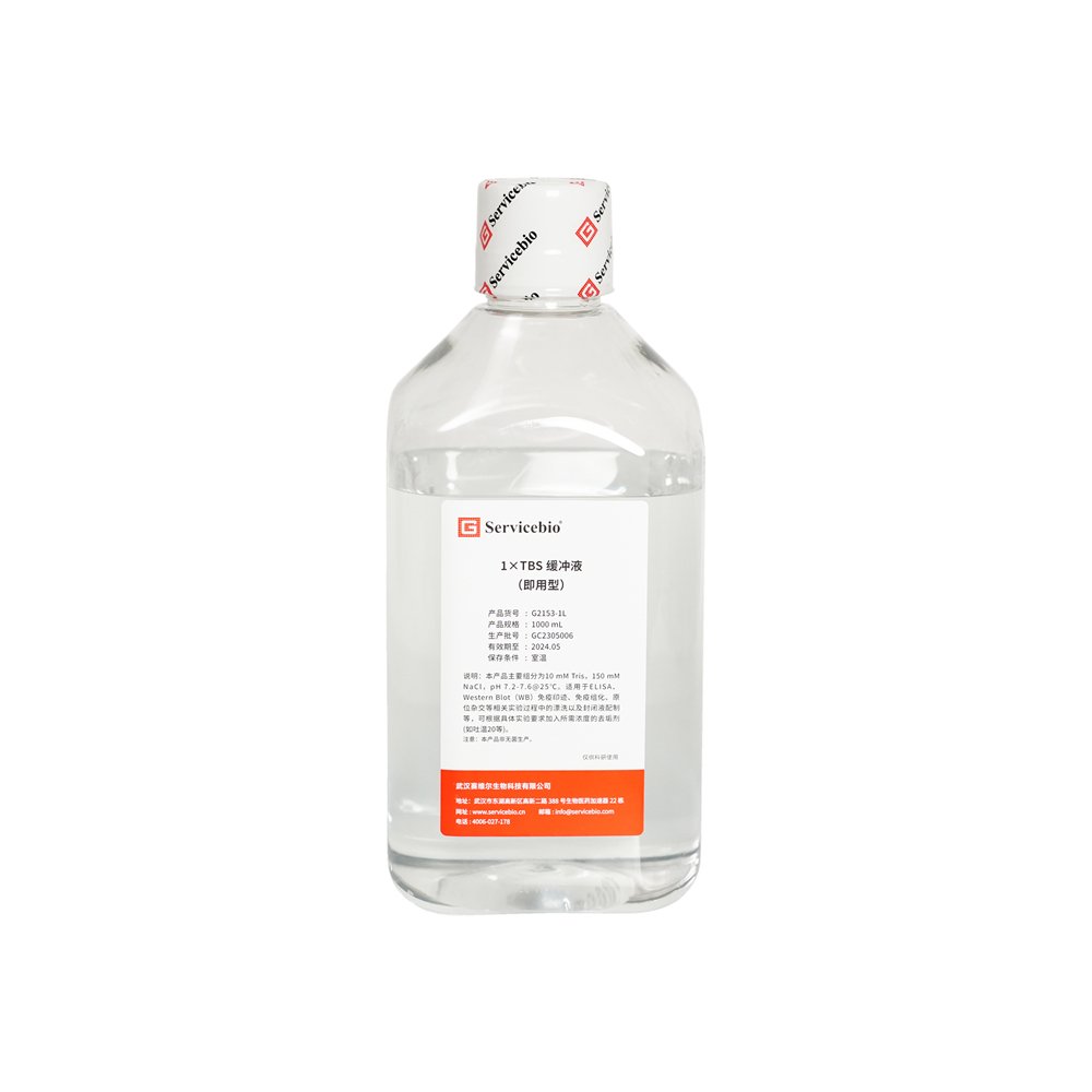 Tris Buffered Saline (TBS) buffer can be used for rinsing during ELISA, Western Blot (WB) immunoblotting, immunohistochemistry, in situ hybridisation and other related immunological experiments, as well as for blocking solution preparation. This product is a 1× ready-to-use solution, the main components are 10 mM Tris, 150 mM NaCl, pH 7.2-7.6@25.