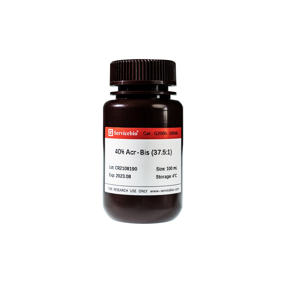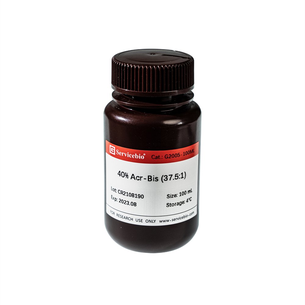 40% acrylamide (37.5:1) is an aqueous solution containing 40% acrylamide, with a ratio of acrylamide and methyl-diacrylamide is 37.5:1. It is commonly used for the preparation preparation of PAGE gels and SDS-PAGE gels for the separation of protein or nucleic acid, and is a common stock solution used in molecular biology laboratories for gel preparation.