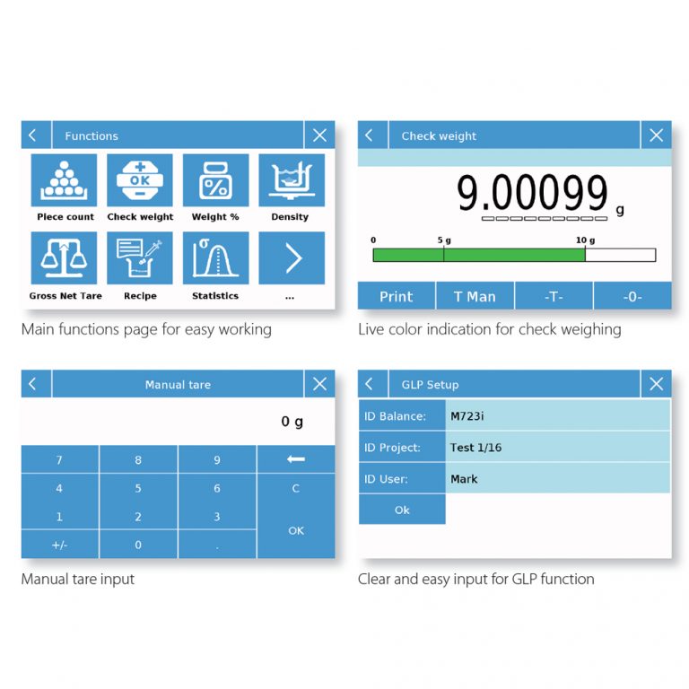 Images are for illustrative purposes only | » Electromagnetic force restoration weighing system » Highly integrated weighing cell » Automatic internal calibration » 5’’ Touch-screen Display 800×480 » RS232 serial interface » Selectable Measuring units » Internal Database » GLP » Multi Languages (EN-DE-FR-IT-SP-PT) » Multi-user with password protection » USB port for import/export database data |