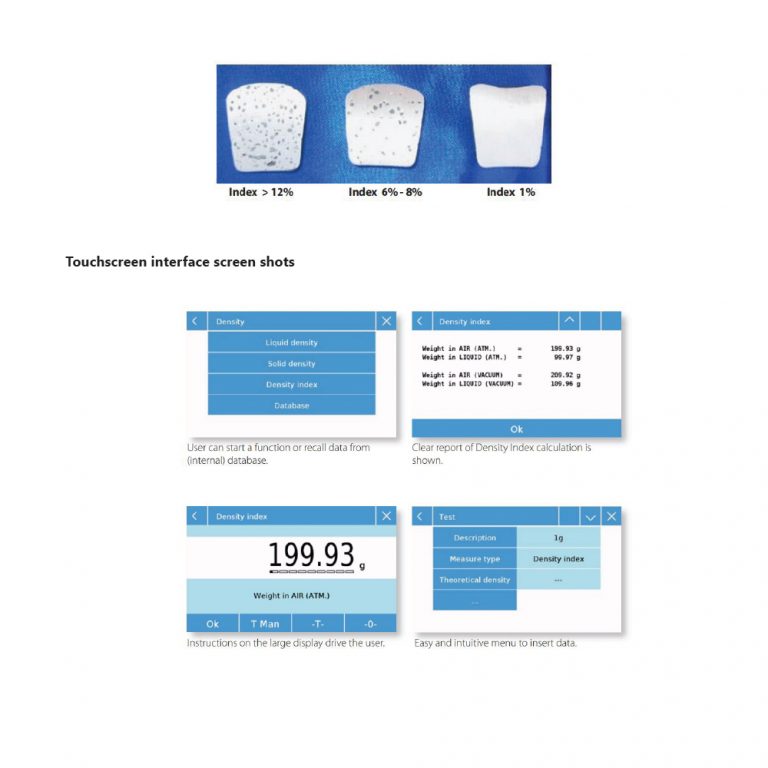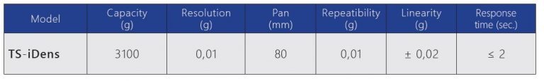 TS-iDens is a Balance for density calculation, in particular it is designed to easily determine the Density Index of a solid sample without need of any computer software or external database.