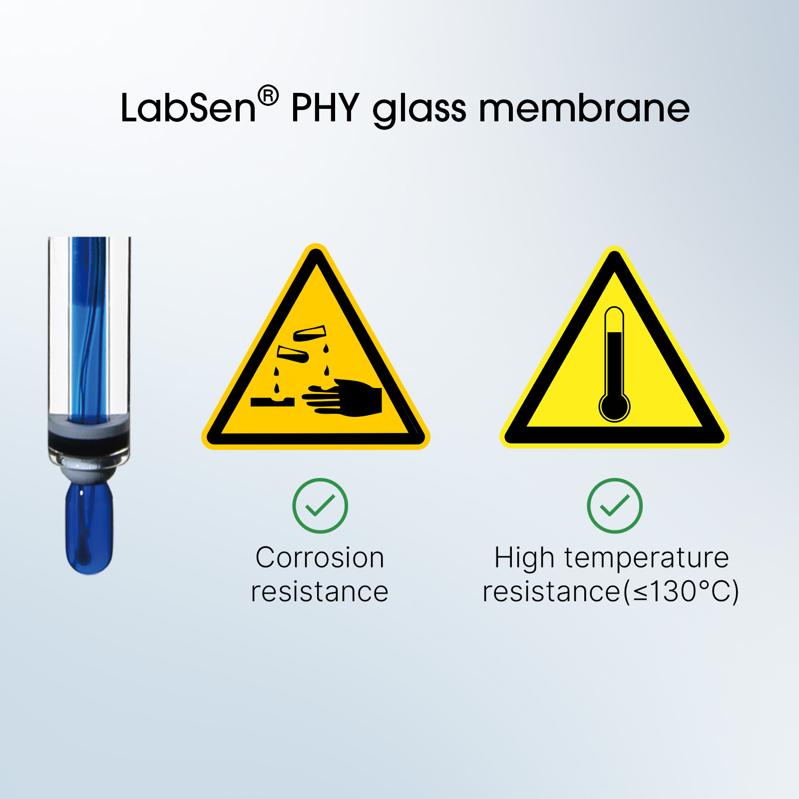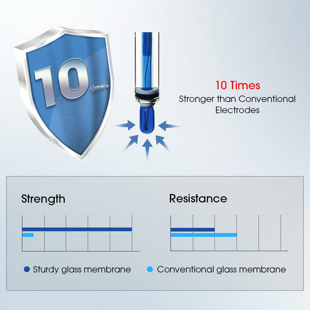 • Equipped with Swiss LabSen 865 pH/Temp. electrode engineered to withstand high temperature and complex/corrosive liquids with the most robust PHY membrane and PTFE junction
