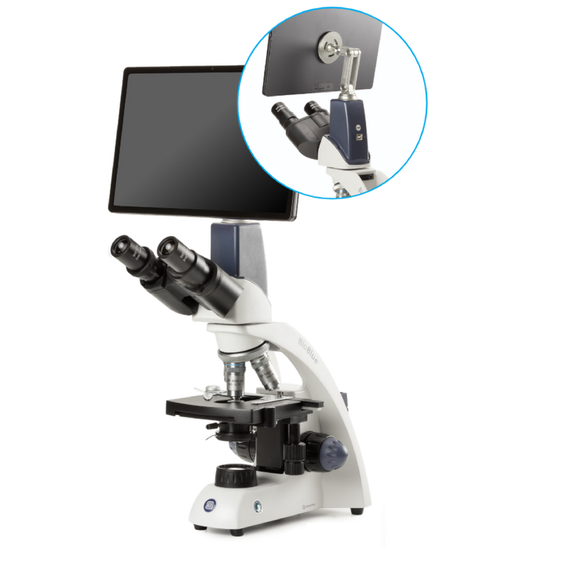BioBlue binocular with 10" tablet and built-on 5 MP digital microscope. Equipped with SMP 4/10/S40/S60x objectives with mechanical stage. 1 W Dual color NeoLED illumination. With 3 rechargeable AA batteries and external 5 Vdc USB-C 100-240 Vac multiplug power adapter