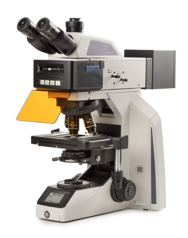 • Equipped with LED fluorescence attachment with rotating turret and UV protection shield.