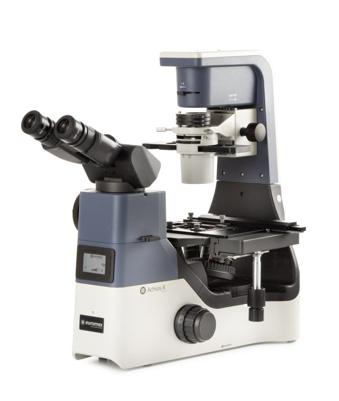 Achios-X Inverso Binocular Ergo 5-35° tilting head inverted microscope with WF10x/22 mm eyepieces. Plan PLi 4x and Plan PLPHi 10x/20x/S40x phase contrast IOS objectives with 5-positions nosepiece. Rotating disc for phase contrast. Transmitted 3W NeoLED adjustable illumination