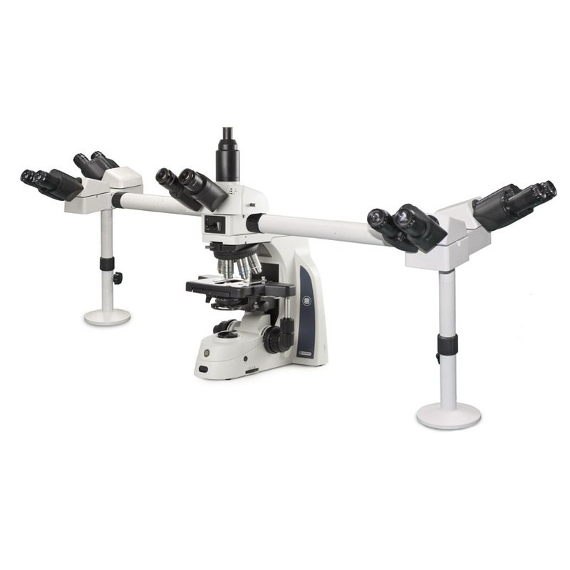 The Delphi-X Observer can be extended with a unique multihead system for in total 2, 3, 5 or 10 heads allowing simultaneous observation of specimens. The central attachment is equipped with a trinocular head and with a joystick to move a green or red laser pointer across the entire field of views of all heads.