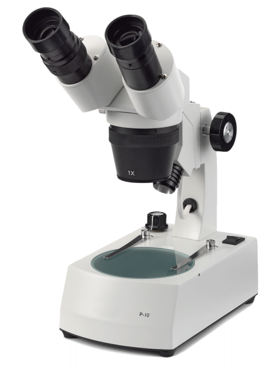 Binocular stereo microscope P-20, head with 45° inclined tubes, 2x/4x revolving objective, 20x/40x magnification with rack and pinion stand equipped with 10 W incident and transmitted halogen illumination