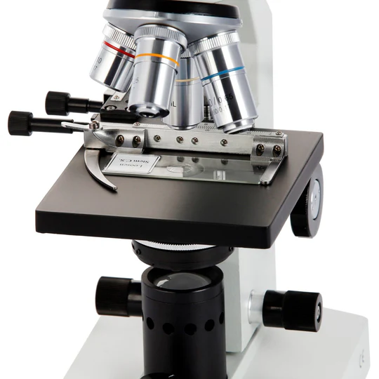 The stage is equipped with two clips for holding slides and other specimens in place. Additionally, a mechanical caliper is included to provide more precise positioning of specimen slides when using high magnifications. The microscope uses independent focus knobs to control coarse and fine adjustments. An adjustable limit-stop mechanism can be used to prevent the lenses from making contact with specimens, preventing damage to the lenses and glass slides.