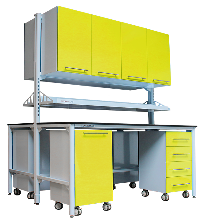 AdvancelabPro Steel Casework Our floor mounted steel casework is the lab furniture of tomorrow. It is flexible and allows infinite modifications at site with a “sliding knee space” concept. Construction uses electrogalvanized steel sheets with heavy epoxy powder coating. Quality hinges, door handles and drawer pulls lend to durability and years of trouble free use. We stock both epoxy and phenolic resin table tops to ensure quick ship possibilities to our ever growing export division.